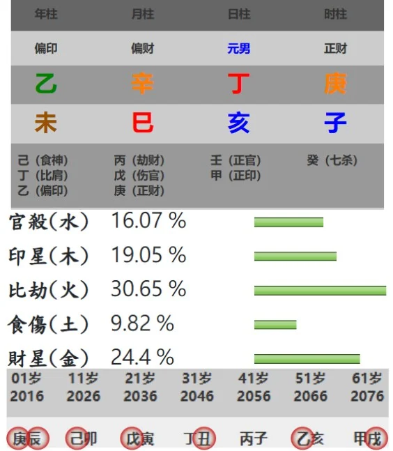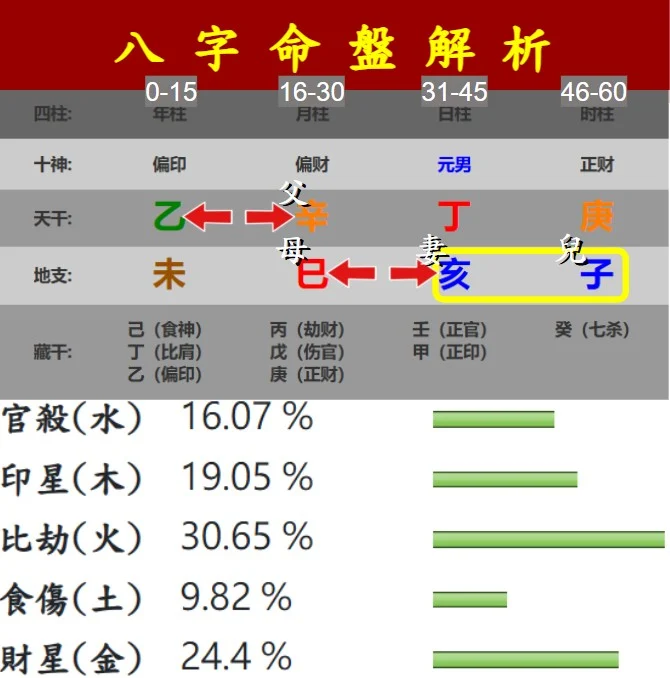 命帶兩組六沖是這組八字的最大缺陷:第一組乙辛沖,父親是『辛金』與日主『丁火』無緣;第二組巳亥沖,『巳火』在月支是母位,雖與日主『丁火』理氣相連緣份頗深,但命主妻位是『亥水』,妻位『亥水』大沖母位『巳火』,日後的婆媳關係對立嚴重,屆時母位氣傷病危,爾後妻位『亥水』,又與『子水』相合,代表紅杏出牆,帶著孩子離開爸爸。