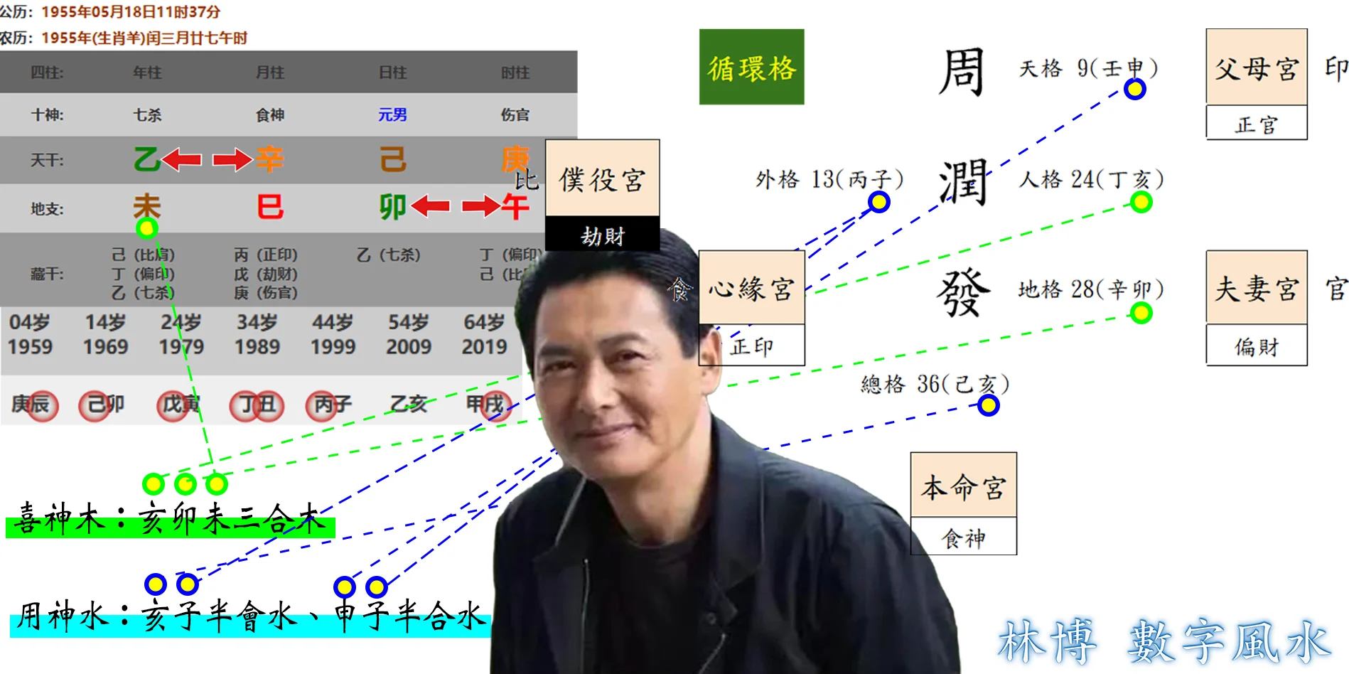 真正幫扶的大功臣是『周潤發』這個好名字,進到了八字提供非常好的修補作用,若無此姓名格局幫身八字,這種本命是成不了氣侯的:周潤發是己土身強,地支巳午未三會火為正印格,恰好姓名架構中的水木成局符合喜用,進到八字形成了『亥卯未三合木』的七殺成格,幫襯八字成了『殺印相生格』,建立了大哥級的威信。