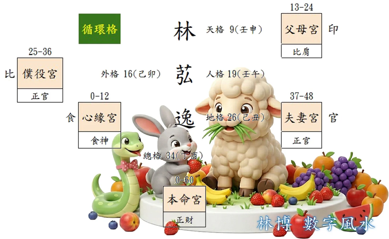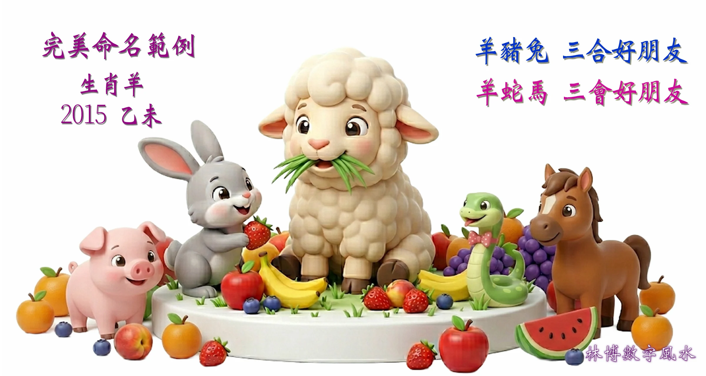 所以『林苰逸』讓生肖羊形成一幅非常棒的畫面,就如同下圖,一隻豐衣足食的羊,被牠最喜歡的好朋友們圍繞著(蛇是三會好朋友、兔子是三合好朋友),在情緣宮及事業宮都非常加分。