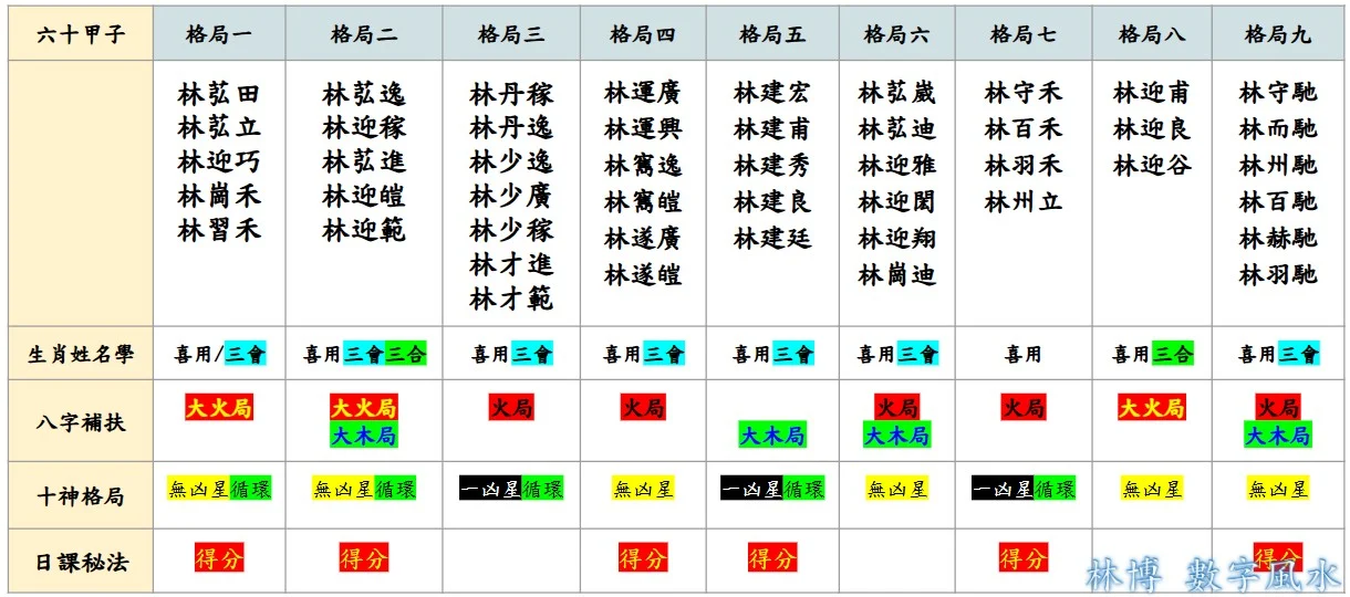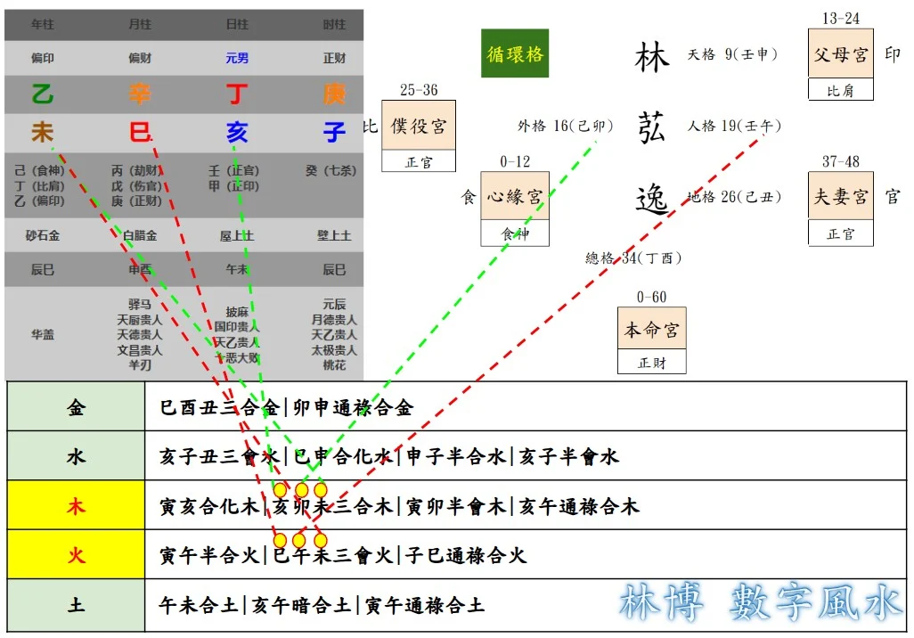『林苰逸』的內在六十甲子格局,與先天八字相結合,形成了一組新的五行格局:在用神上補上最強的三合木局及三會火局,另外在土金水的三組五行也都形常非常好的三合三會格局,足以扺抗任何八字流年帶來的巨大沖擊。