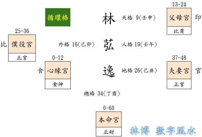 此處以『林苰逸』示範解說:此處十神格局除了完美無凶神之外,更是進入了更高層級的循環格,形成最上乘的『五福俱全格』,非常少見的好格局,用上這種格局的人自然很容易飛黃騰達。